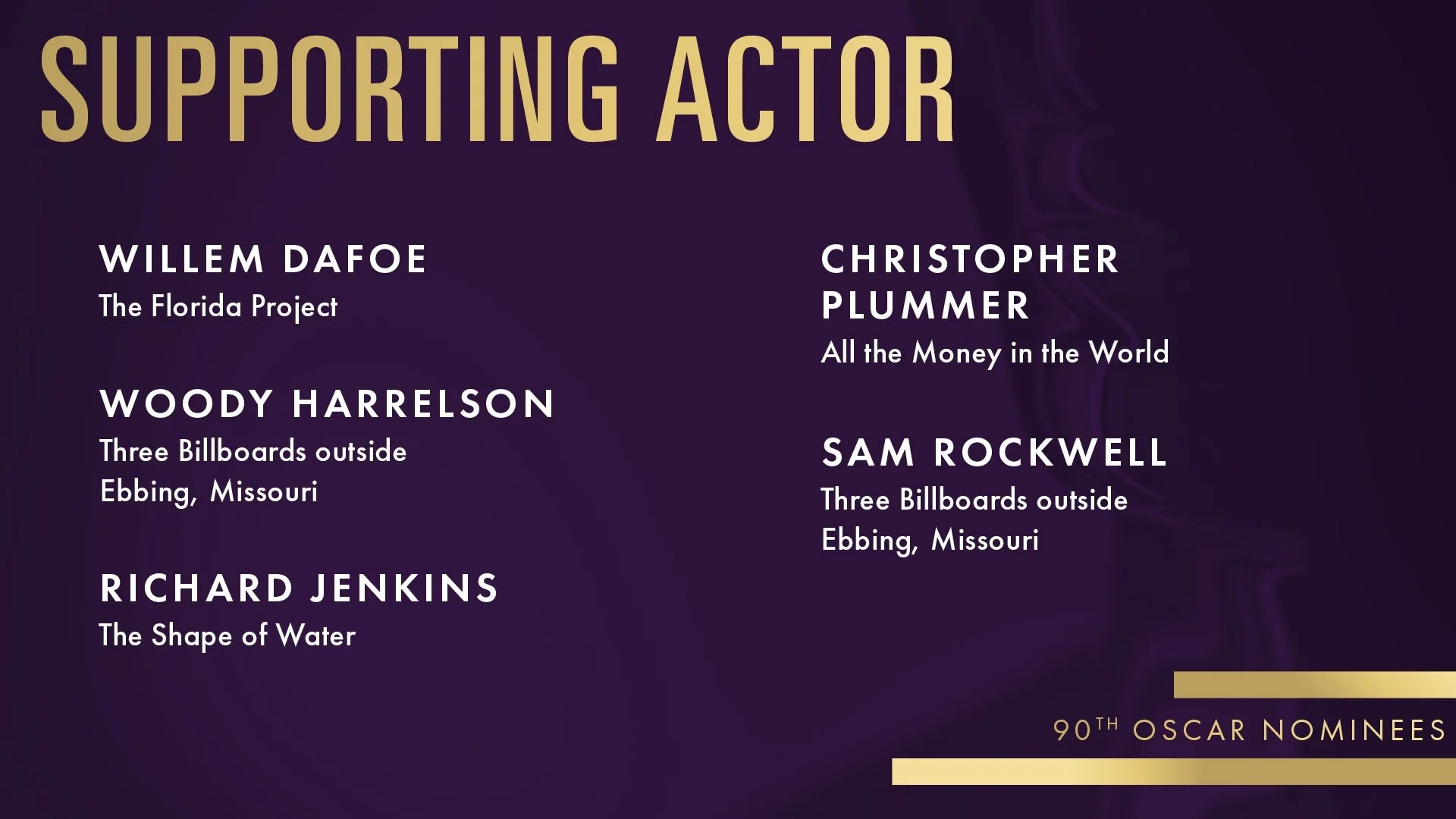 I was betting on two nominees from the same film ('Call Me By Your Name'), which is a rare occurrence, but it ended up being no nominees from that film and instead, two nominees from 'Three Billboards'. I have a feeling it's a two-way race between Plummer and Rockwell, with Plummer ultimately winning.